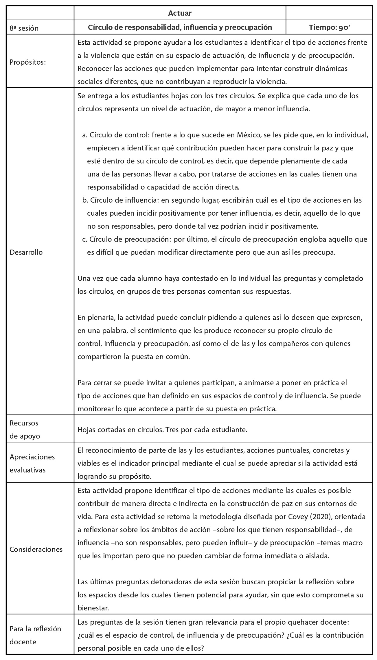 Acciones individuales. Además, quienes participan tendrán una actividad para identificar sus espacios de actuación, de influencia y de preocupación. Con ello se busca facilitar una reflexión que, sin imponerles acciones concretas, les permita identificar posibles áreas de contribución. Esto busca fortalecer la agencia de los estudiantes, es decir de dar forma e influir en ciertos eventos, y ser conscientes de esta capacidad (Bandura, 2000).