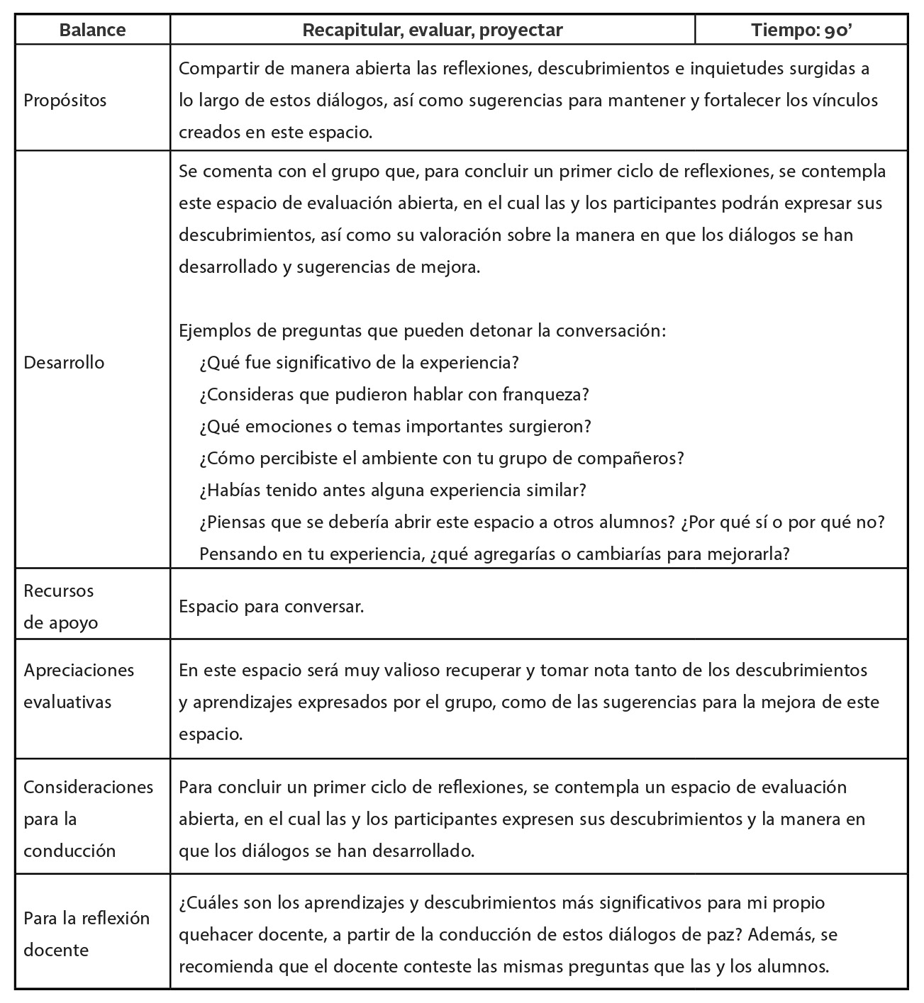 La experiencia de conducir un proceso de diálogo desde un espacio curricular o extracurricular con estudiantes supone de parte de las y los docentes reconocer, en primer lugar, que la violencia y las heridas de la violencia también les afectan en lo emocional, puesto que comparten el contexto del país. Implica, además, animarse a incursionar en una experiencia que probablemente movilizará supuestos y creencias, percepciones y concepciones; reconocer sus comportamientos en situación y la manera en que la experiencia va dejando huella (Argyris y Schön, 1992; Schön, 1998). Con ello verán enriquecidas sus prácticas pedagógicas, cualquiera que sea la asignatura que tengan a su cargo. Además, se recomienda que quienes faciliten las sesiones mantengan una breve bitácora en la que puedan registrar sus observaciones al término de cada sesión (cuadro 2). Por ello introducimos al final de cada sesión una pregunta para animar la reflexión docente.