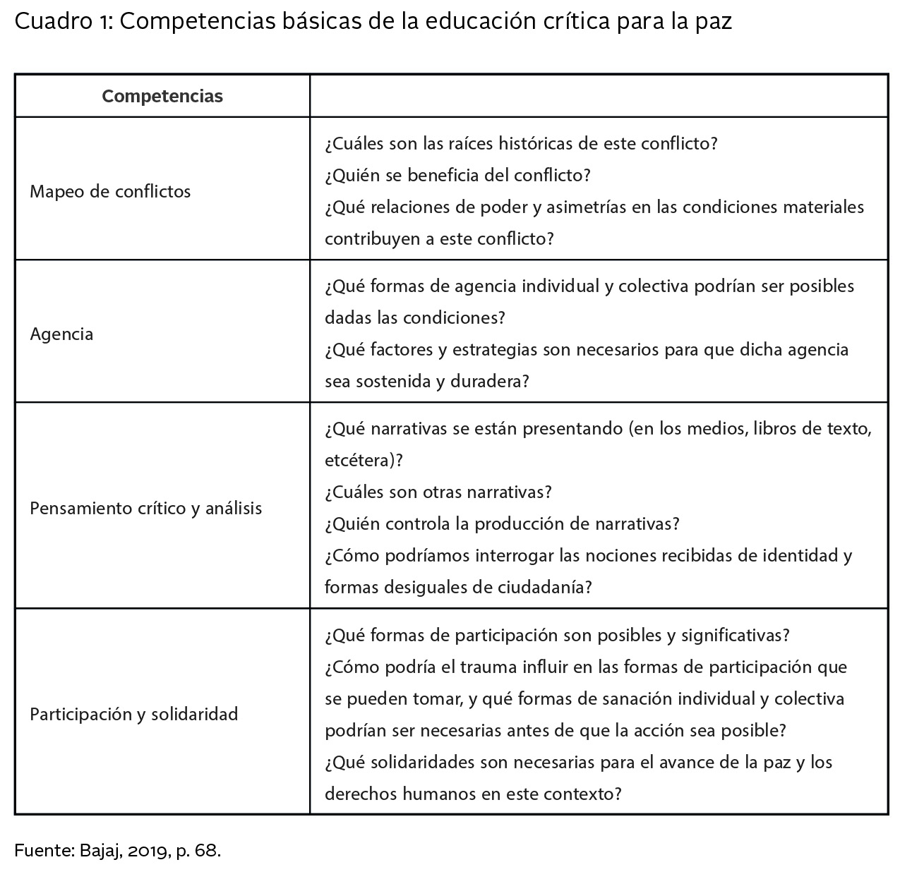 Bajaj (2019) sostiene que la educación crítica para la paz promueve las siguientes competencias a partir de posibles interrogantes (cuadro 1):