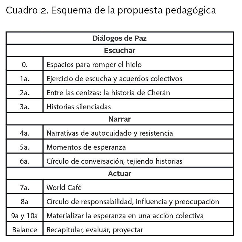 Además de retomar elementos importantes de la pedagogía de Freire (1998, 2017) y la pedagogía crítica para la paz, la propuesta integra aportes de la justicia restaurativa (Boyes-Watson y Pranis, 2010); la psicología (Denborough, 2008; White y Epston, 1990; Bandura, 2000), y la mediación y resolución de conflictos (Cobb, 2013; Chaitin, 2003). Particular importancia otorgamos a las prácticas narrativas colectivas, las cuales ofrecen un espacio para legitimar la experiencia personal que se pone en diálogo con la comunidad, destacando tanto la diversidad de historias como la manera en que se entretejen unas y otras. Para Denborough (2008) un elemento central de las prácticas narrativas colectivas es que los actores reconozcan su potencial para influir de manera positiva en la vida de los otros, ya que considera que este posicionamiento es necesario para separarse de una concepción pasiva de victimización y para la recuperación de agencia.