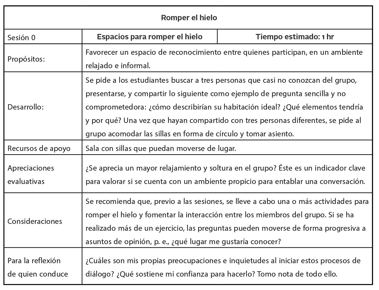 Acuerdos básicos. En la primera sesión es importante establecer de forma colectiva las reglas básicas durante las sesiones, por ejemplo, no interrumpir, dar las mismas oportunidades de hablar, pero sin presionar a las personas que aún no se sienten cómodas, entre otras (Chaitin, 2003).