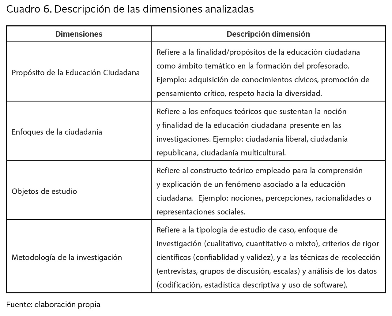 En ese marco, la discusión se centra en cinco dimensiones emergidas del análisis de contenido cualitativo: propósito de la educación ciudadana, enfoques de la ciudadanía, objetos de estudio, y metodología de la investigación (cuadro 6).