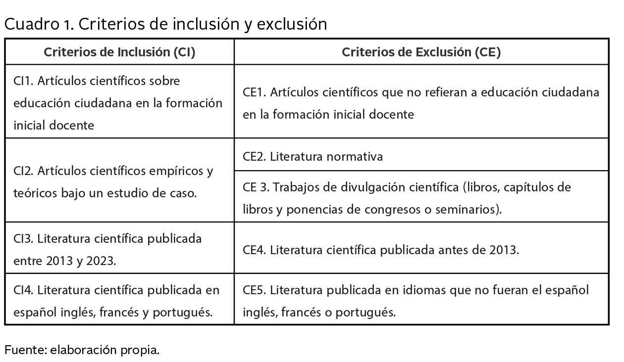Para el desarrollo de esta investigación se establecieron cuatro criterios de inclusión (CI) y cinco criterios de exclusión (CE). Los criterios de inclusión fueron: artículos científicos sobre educación ciudadana en la formación inicial docente; revisión de artículos científicos teóricos y empíricos bajo un diseño de estudio de caso; literatura científica publicada entre 2013 y 2023, y literatura científica publicada en español, inglés, francés y portugués. En tanto, los criterios de exclusión (CE) fueron: artículos científicos que no refieran a educación ciudadana en la formación inicial docente; literatura normativa; trabajos de divulgación científica (libros, capítulos de libros y ponencias de congresos o seminarios); literatura científica publicada antes de 2013, y literatura científica publicada en idiomas que no fueran español, inglés, francés o portugués (cuadro 1).