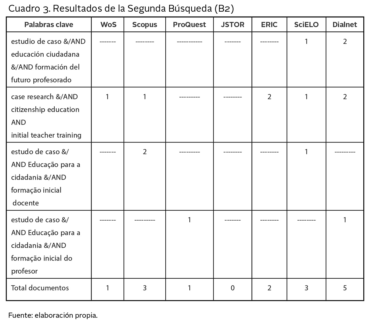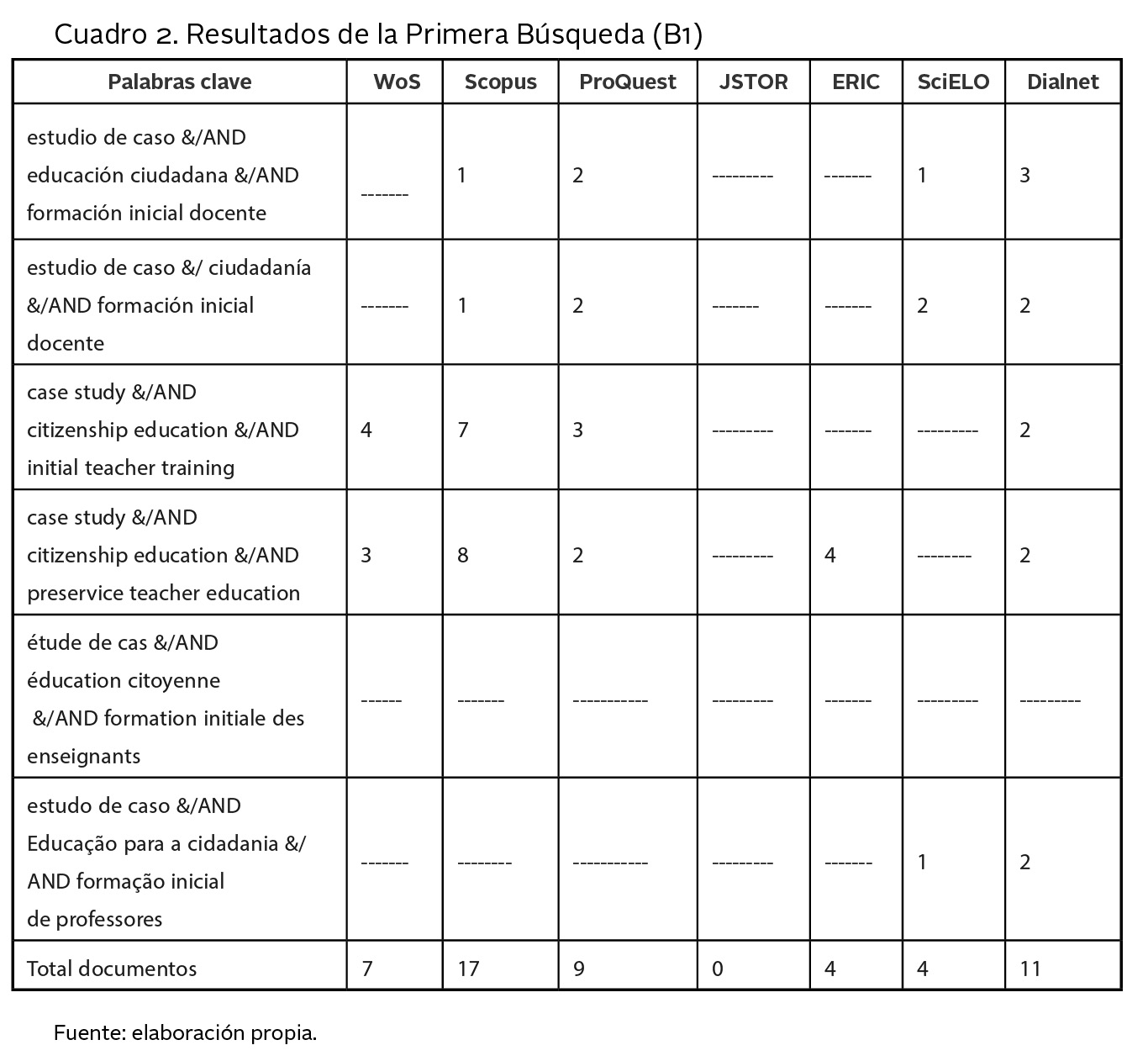 Durante la primera búsqueda (B1), se introdujeron las palabras clave y los boleanos &/AND en las bases de datos. Las combinaciones de las palabras clave utilizadas fueron: estudio de caso &/AND educación ciudadana &/AND formación inicial docente; estudio de caso &/ ciudadanía &/AND formación inicial docente; case study &/AND citizenship education &/AND initial teacher training case study &/AND citizenship education &/AND preservice teacher éducation étude de cas &/AND éducation citoyenne &/AND formation initiale des enseignants estudo de caso &/AND Educação para a cidadania &/AND formação inicial de professores. La primera búsqueda arrojó 52 documentos, distribuidos de la siguiente forma: siete documentos en WoS; 17 documentos en Scopus; nueve documentos en ProQuest; 0 documentos en JSTOR; cuatro documentos en ERIC; cuatro documentos en SciELO, y 11 documentos en Dialnet (cuadro 2).
