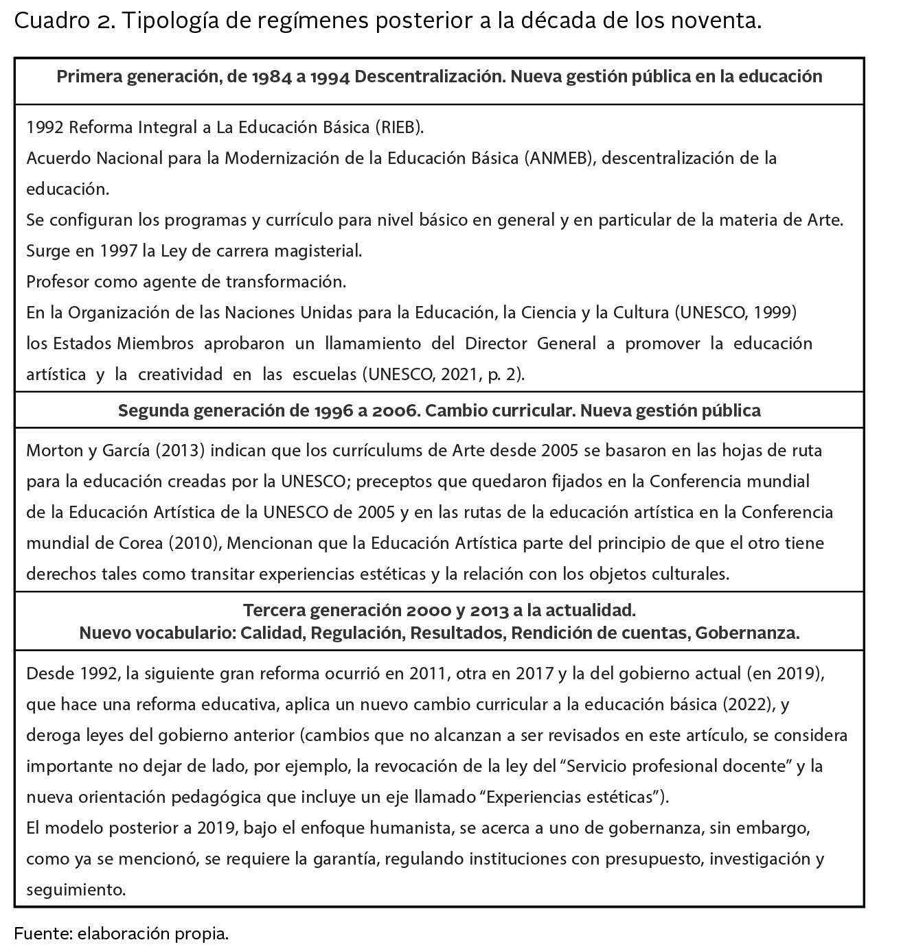 La perspectiva en el actual siglo XXI es llevar la discusión de la cultura y a la EEA al campo del derecho; los problemas antes mencionados son indicio de que los derechos se están resignificando por regímenes autoritarios, residuales y corporativos,4 en los que incluso el derecho se vuelve contractual. Es ese mismo razonamiento, el que determina los significados que la sociedad, docentes e instituciones dan a la educación artística y determinará el contenido, método y técnicas de enseñanza de la EEA. En adición, el siglo XXI exige incluir las perspectivas de género, raza, religión, origen y familiarismo, pues son todas ellas la base que sostiene las relaciones de producción económica-cultural-social de una comunidad, localidad y un país. Sin embargo, el presente artículo se centrará en los tipos de regímenes y su relación con la EEA.