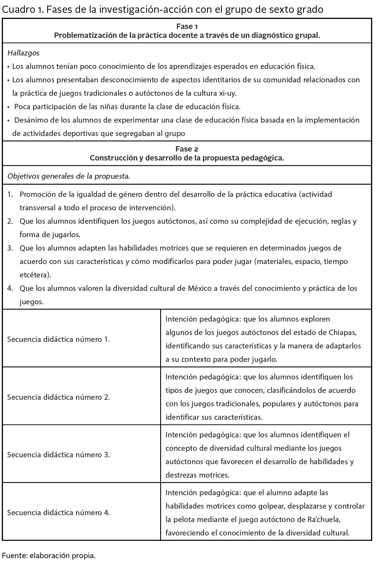 Por ello la pregunta de investigación que se plantea para este estudio es ¿cómo se promueve la igualdad de género a través de la práctica docente de la educación física en un grupo de sexto grado de primaria en un contexto indígena desde un enfoque interdisciplinar? Para los fines de este artículo, el objetivo es analizar y reflexionar la práctica docente en EF con un grupo de estudiantes xi-uy de sexto grado de primaria a partir de los resultados de una investigación-acción realizada (Martínez-Aguilera, 2020).