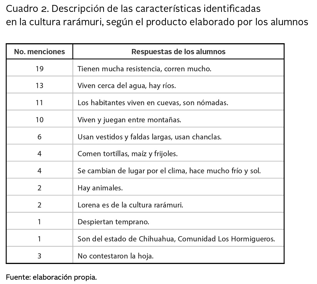 Además, el alumnado respondió a preguntas propuestas por la docente, en las que se describen características de la cultura rarámuri en relación con la ubicación, vestimenta, tareas que realizan y juegos autóctonos propios de la comunidad como se representa en el cuadro 2.