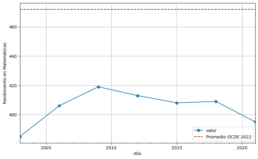 En México, en Latinoamérica y en diversas regiones como el Norte de África y Oriente Medio, el aprendizaje de las matemáticas ha representado un problema grave (Haase y Krinzinger, 2019). La educación matemática parece estar asociada con la calidad de vida de las personas y su prosperidad (Dockendorff y Gomez Zaccarelli, 2024; Zacharopoulos et al., 2021), que varía por países, así como con factores socioeconómicos, pues los estudiantes provenientes de familias con bajos ingresos tienen un rendimiento significativamente inferior en matemáticas en comparación con sus pares de familias con mayores ingresos (Jordan y Levine, 2009). En la figura 1 se aprecian los resultados recientes de PISA 2022 para México, donde se observa una curva descendente y alejada del promedio de la OCDE para 2022. Ninguno de los 13 países que se evaluaron en Latinoamérica estuvo por arriba de dicho promedio (BBC, 2023).