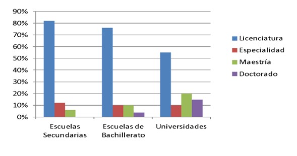 Adicionalmente, para contar con una idea sobre la demanda potencial, se efectuó un sondeo a 26 instituciones educativas de la zona circunvecina sobre el nivel de estudios que ofrecen. Éstas indicaron que 57.69% son de nivel bachillerato, 34.62% nivel secundaria y 7.69% licenciatura. Donde 23.08% son instituciones privadas y 76.92% públicas. El nivel educativo reportado por los maestros de matemáticas se muestra en la figura 4. Puede verse que la mayoría del profesorado cuenta únicamente con licenciatura.