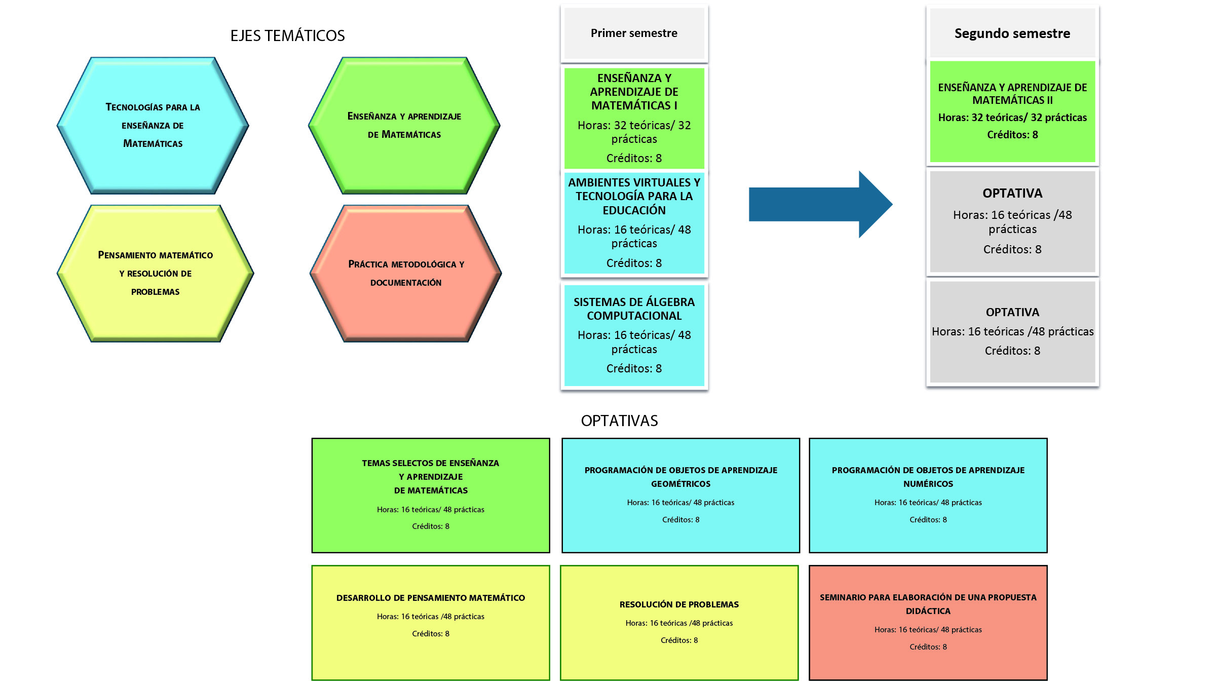 El mapa curricular es muy sencillo, son tres actividades académicas por semestre, cada una de 16 horas teóricas y 48 prácticas al semestre. En el primer semestre hay tres asignaturas obligatorias y en el segundo, una obligatoria y dos optativas. Esto otorga flexibilidad al Plan de Estudios.