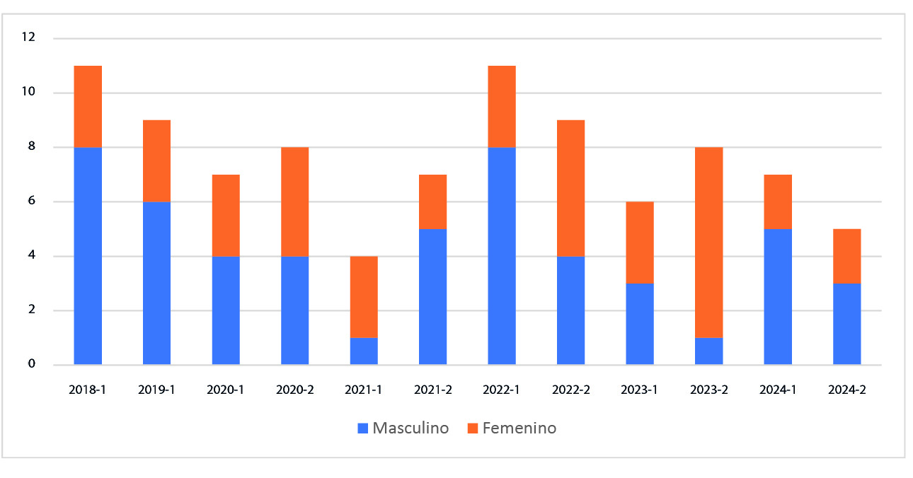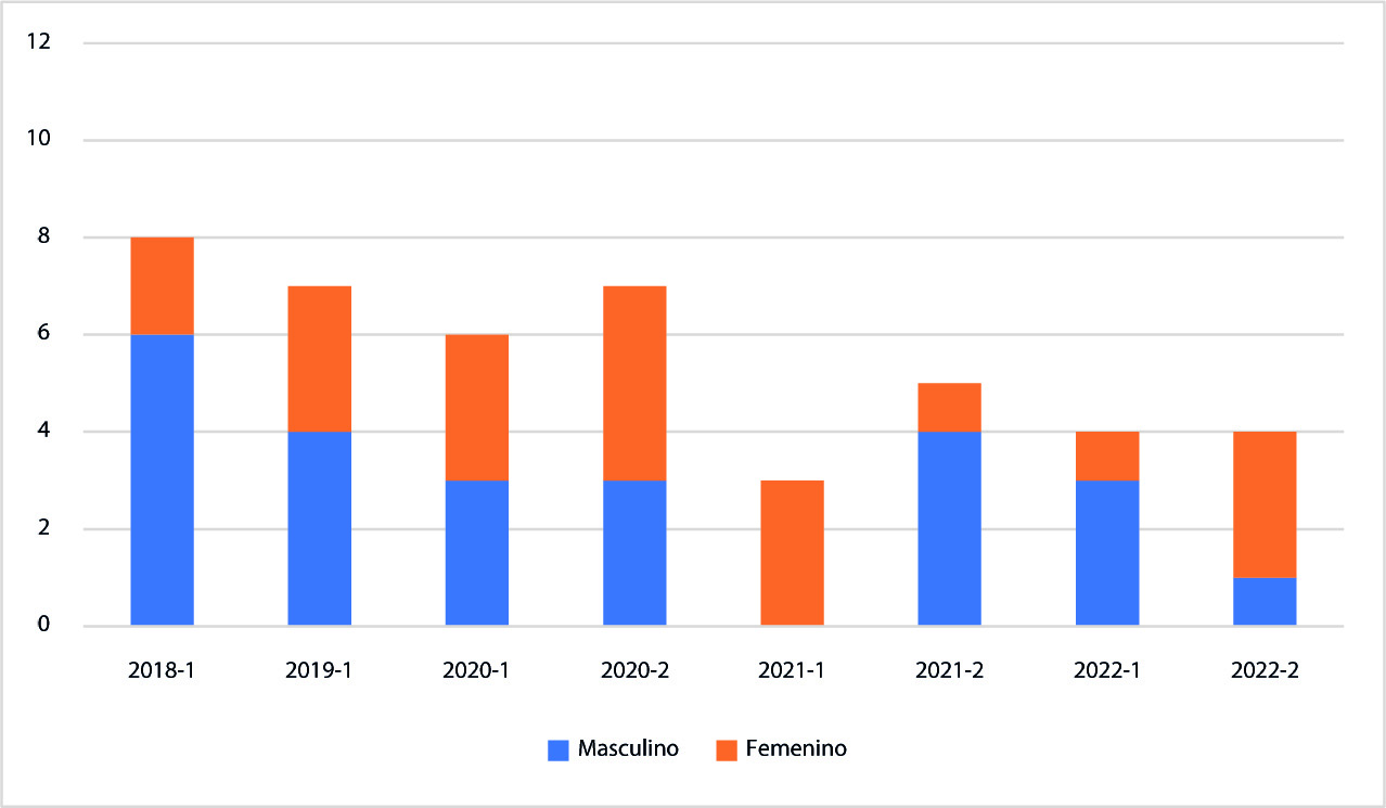 En la figura 6 puede apreciarse que, durante el semestre 2021-1, cayó la matrícula. Esto puede ser debido al confinamiento ocasionado por el Covid-19, o por la apertura de dos semestres de nuevo ingreso a partir del año lectivo 2020.
