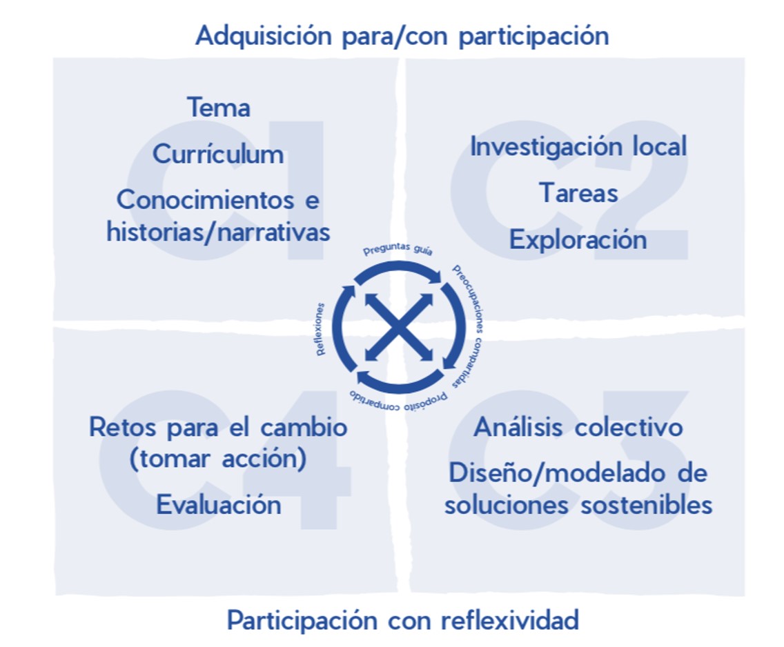 Consisten en secuencias de cuatro cuadrantes que propician un aprendizaje situado, activo y en conexión con el entorno social y ecológico donde se ubica la escuela (ver figura 1). En el cuadrante 1, se inicia con una narrativa creada por el/la docente que parte de las preocupaciones y conocimientos locales que identificó y que busca, con el poder de las historias, situar el tema central evocando también a la emoción, la experiencia vivida y la conexión afectiva con lo que preocupa. Asimismo, incluye un apartado llamado “Sabías que…”, que articula conocimientos escolares de todas las asignaturas/campos formativos del currículum y con conocimientos locales investigados y relacionados con el tema de la progresión. La articulación de aprendizajes de distintas disciplinas en la progresión se fundamenta en la necesidad de conocer y transformar una realidad compleja que trasciende segmentaciones y jerarquizaciones propias de las ciencias. El cuadrante 2 se orienta a la indagación de los y las estudiantes en el contexto comunitario sobre el tema tratado a partir de sus propias preguntas y así profundizar en los conocimientos y prácticas de cuidado a nivel local, para su posterior conexión con conocimientos y prácticas que emergen desde otros contextos y epistemologías. En el cuadrante 3, se analiza colectivamente lo que se indagó, se profundiza a través de los “Sabías que…” y se planifican acciones que permitan afrontar retos para el cambio que puedan ser asumidos. Los “retos para el cambio” se ubican en el cuadrante 4 y se orientan a realizar transformaciones en escalas factibles en los ámbitos escolar, familiar y comunitario, a corto o largo plazo, que posibiliten también un aprendizaje activo y transformador orientado a desarrollar prácticas de cuidado (Sandoval et al., 2021).