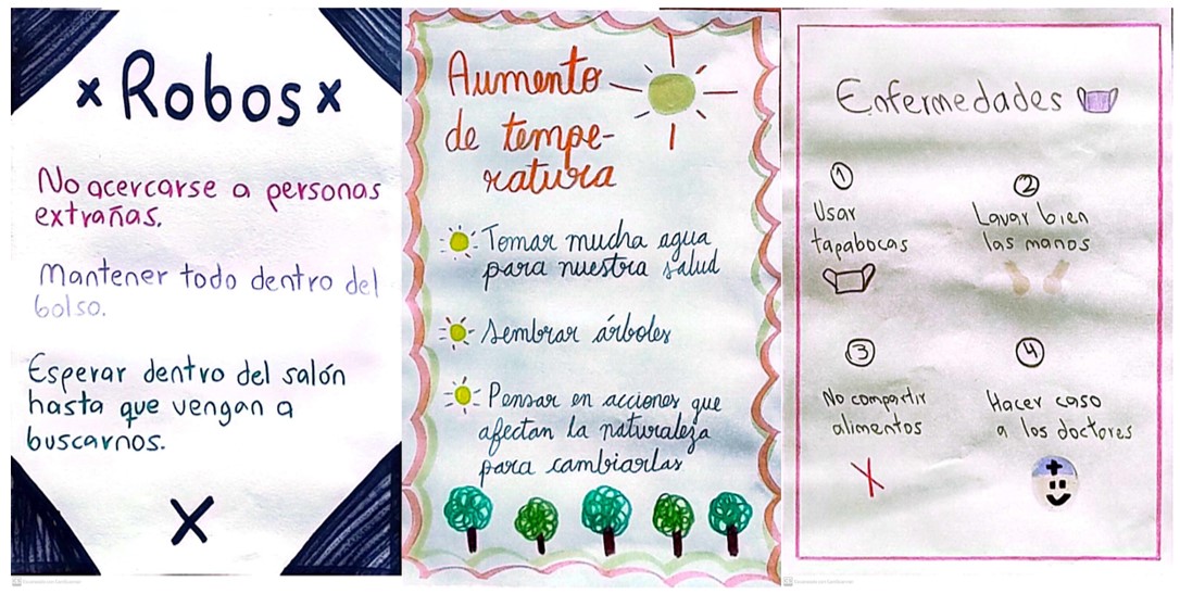 Estos productos reflejaron lo comprendido en el desarrollo de las actividades que componían cada sesión, pues evidencian las diferentes perspectivas y niveles de profundidad alcanzados por los estudiantes, al proponer y plasmar ideas comunes y creativas para reconocer los riesgos de su escuela y acciones a realizar ante ello.