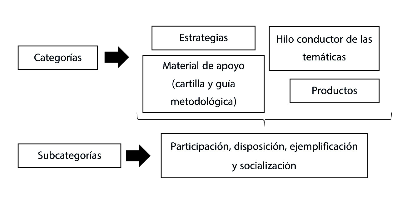 Lo anterior permitió identificar subcategorías (figura 13) en los registros de observación de las sesiones implementadas, que son: la disposición, caracterizada por una actitud de interés sobre lo abordado por medio de la cartilla; participación en las actividades de diálogo, construcción de los nuevos conceptos desarrollados; ejemplificación desde el relato de experiencias y situaciones escuchadas o vividas en torno a los términos clave, y la socialización de los productos creados, en la que se reflejó su comprensión sobre las temáticas revisadas. De esta manera se da cumplimiento a las competencias planteadas para cada unidad.