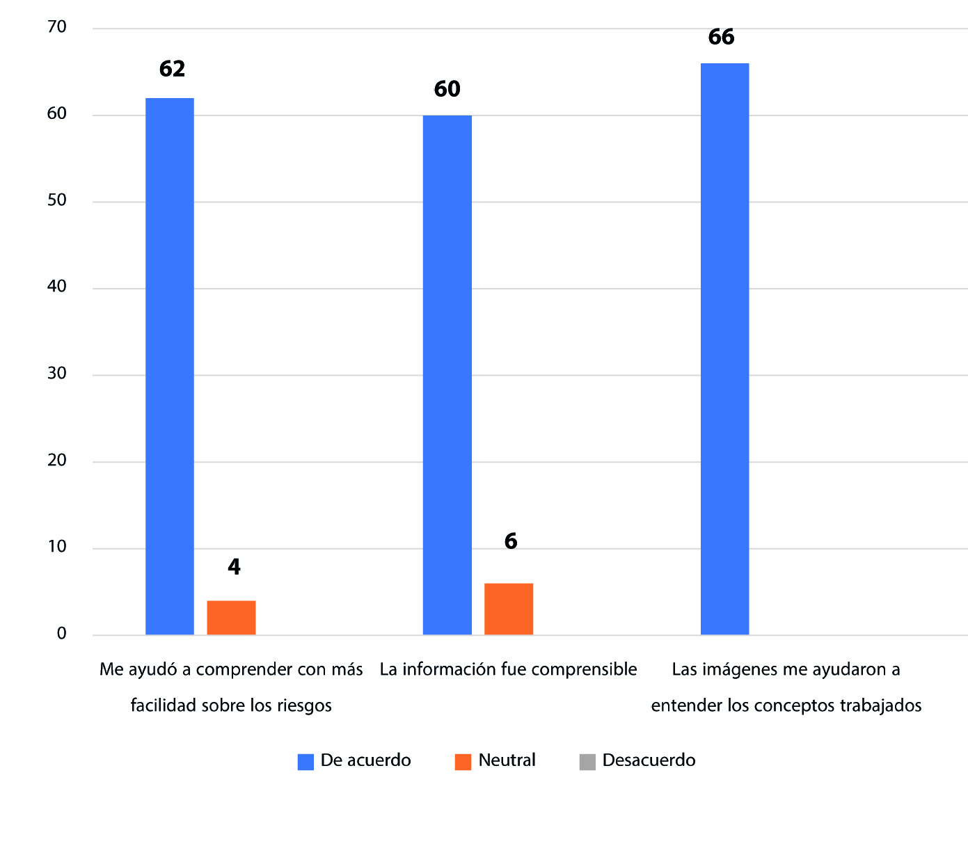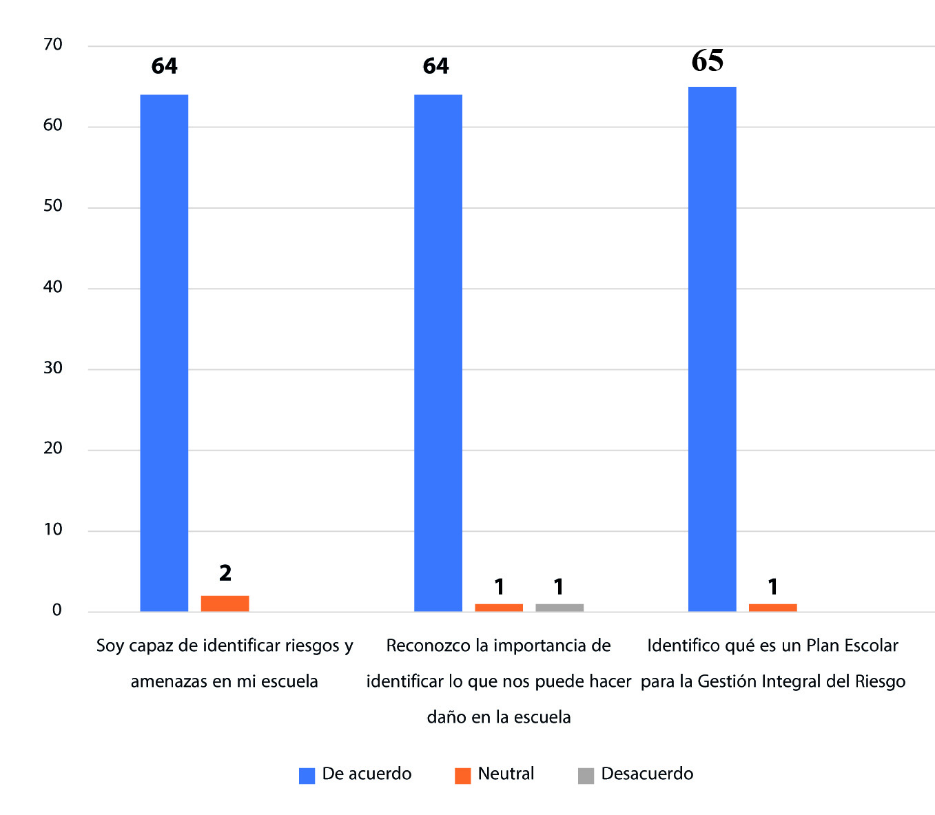 Los resultados mostraron un impacto significativamente positivo, evidenciado por un incremento superior al 86% en las respuestas de los estudiantes, lo que representó un cambio favorable en comparación con los resultados de las encuestas aplicadas inicialmente y reflejó, desde los ítems establecidos en la escala de Likert (figuras 14, 15 y 16), su interés por participar en las actividades planteadas y su contribución al reconocer los conceptos clave, fortaleciendo la capacidad de reconocer riesgos, amenazas y vulnerabilidades del contexto.