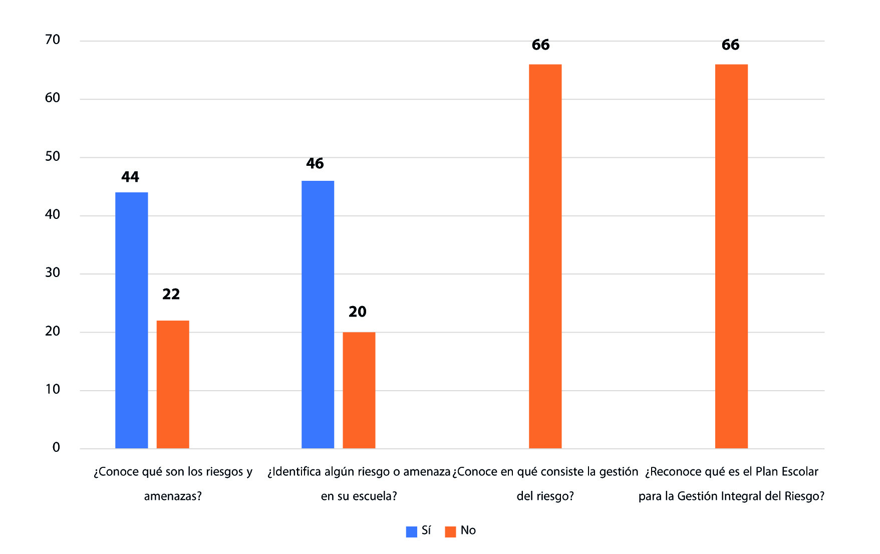 En la fase de Análisis se realizó una encuesta de ocho preguntas a 66 estudiantes del grado tercero, en la que se exploraron los saberes previos sobre los riesgos, la gestión de éstos y las acciones implementadas por la IE para su promoción. En la figura 2 se evidencia que reconocen de forma general los riesgos y amenazas, pero no los relacionan con la gestión del riesgo o el PEGIR.