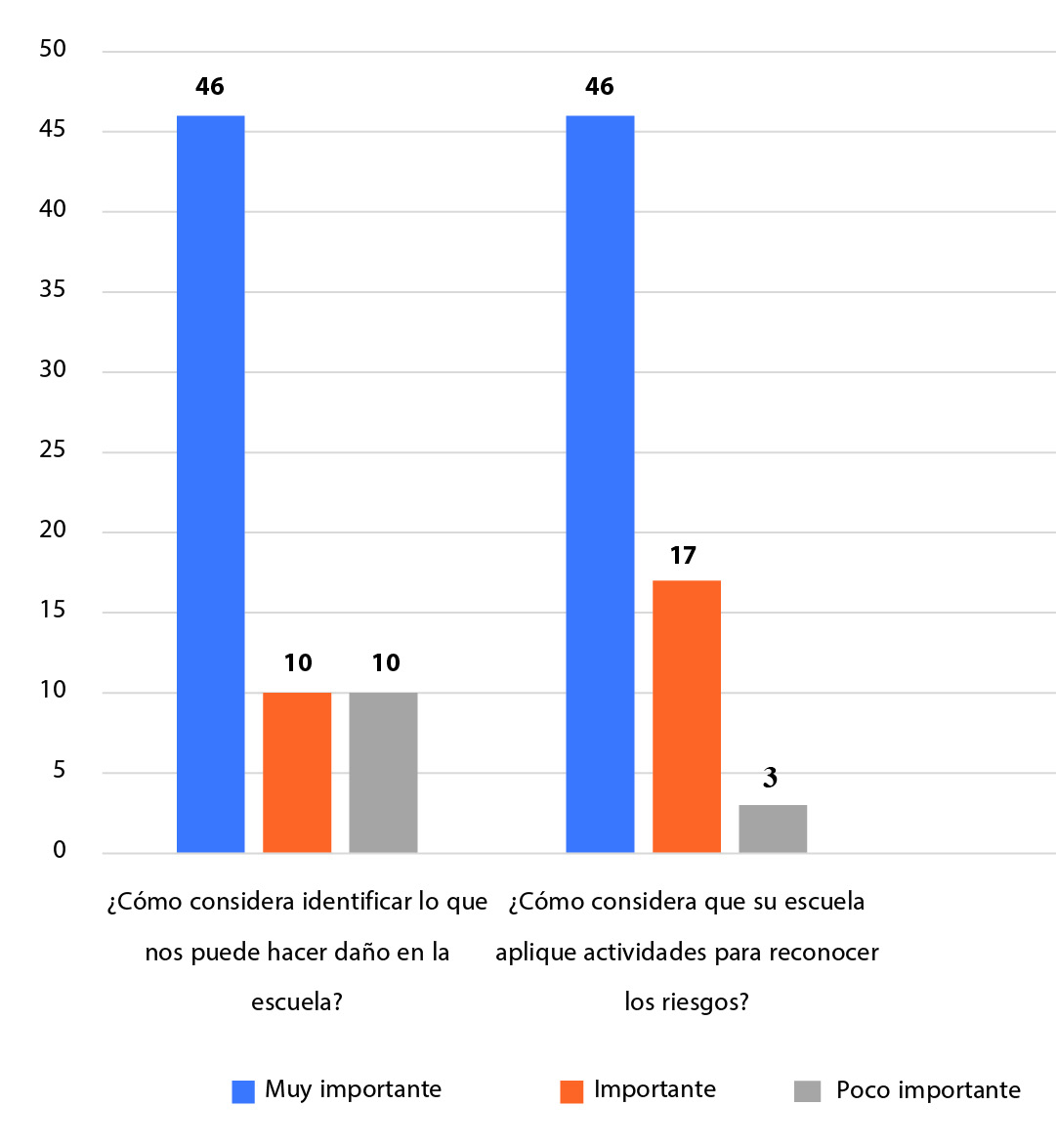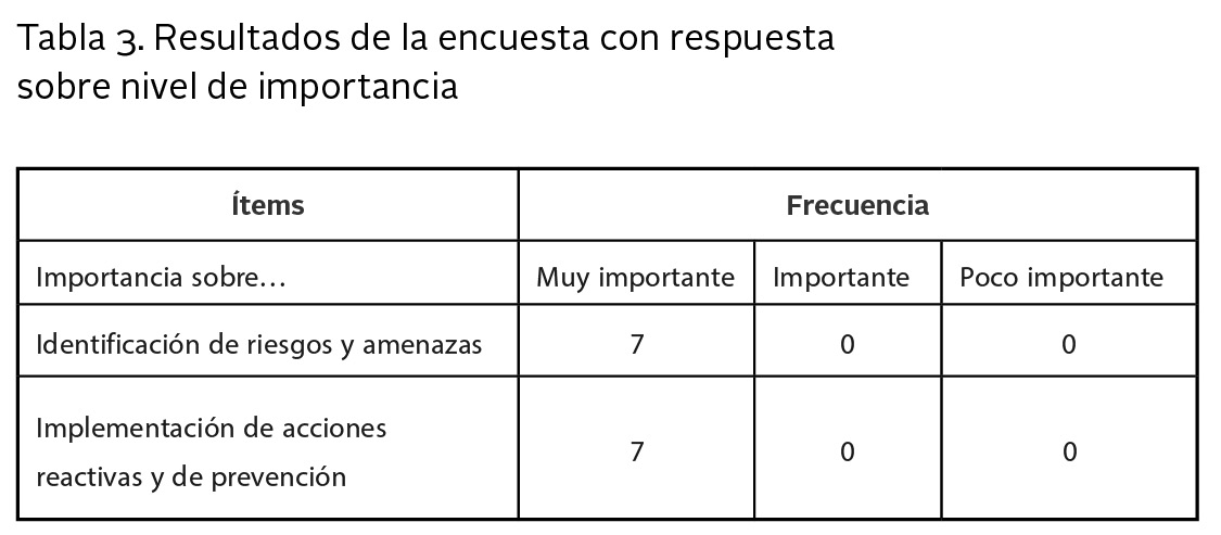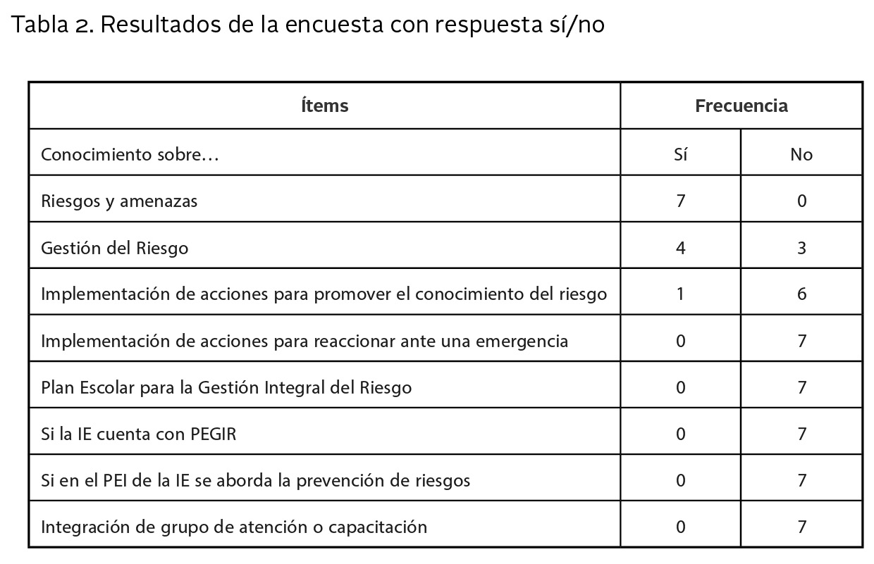 Además, se aplicó una encuesta de 10 preguntas a siete docentes de la IE, cuyos resultados se presentan en las tablas 2 y 3, donde se destaca el desconocimiento sobre la gestión del riesgo o acciones de la IE para promover actividades que conlleven a su identificación. No obstante, se reconoce la importancia de aplicar estas acciones.