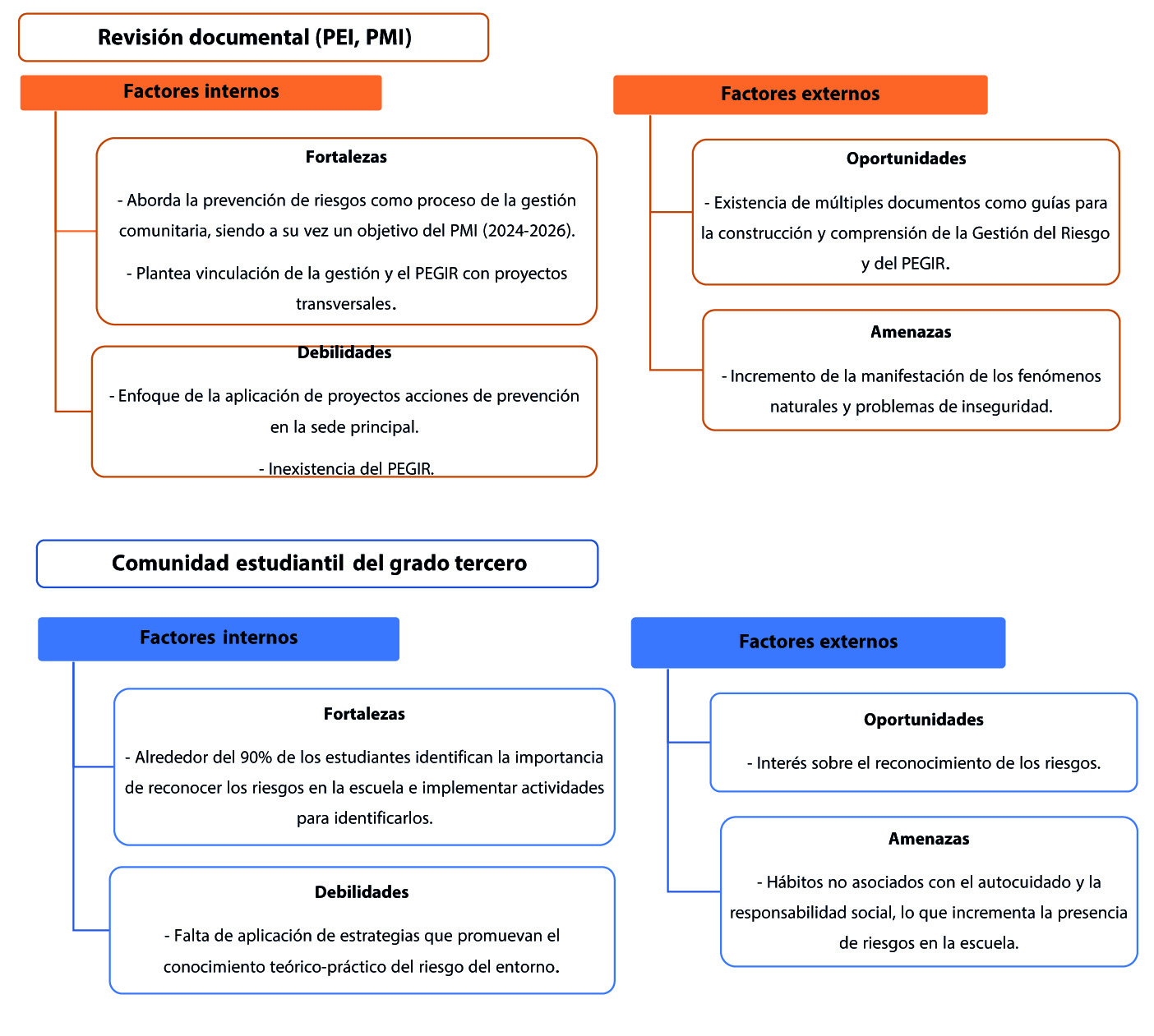 En relación con la revisión documental (PEI y PMI 2021-2023), se identificaron como debilidades el enfoque que se tiene hacia la aplicación de proyectos en la sede principal de la Institución educativa y la falta de construcción del PEGIR, lo que puede generar un impacto negativo por diversas problemáticas, entre ellas, el aumento de fenómenos naturales y la inseguridad del municipio. Se presentan como fortalezas la integración de la prevención de riesgos y el enfoque hacia la mejora desde la implementación de acciones para la Gestión del riesgo, en el PEI y el PMI (2024-2026), y como oportunidad la diversidad de guías del MEN para la construcción del PEGIR, como punto de partida para lo promoción de la prevención en el contexto escolar.