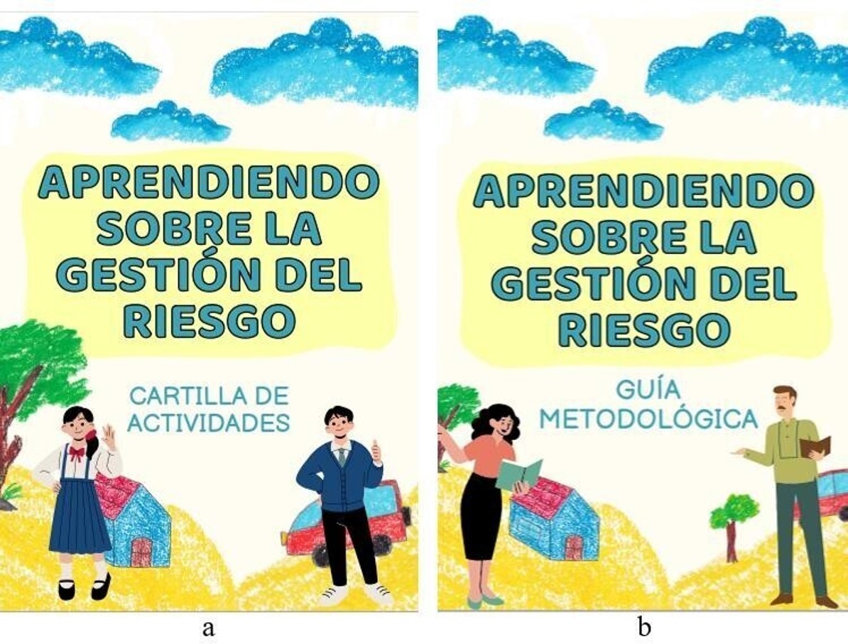 En la fase de Diseño, basada en los resultados del análisis, se definió abordar el modelo didáctico con apoyo de una guía metodológica para el docente (figura 7) en la que se muestran los conceptos centrales de la Gestión del riesgo, los principios que orientan el modelo y los componentes que contiene la ruta metodológica representada en la figura 8; así como una cartilla de actividades para los estudiantes (figura 7), donde se tratan los términos esenciales con el apoyo de ilustraciones y se explican las actividades grupales para contextualizar los mismos.