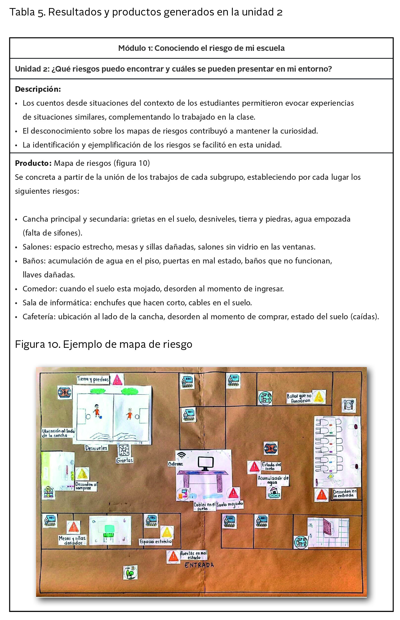 Por otro lado, a partir de los resultados de la escala de Likert, el seguimiento del desempeño, la participación en las sesiones y la presentación de los productos, se determinó el impacto positivo que tuvo la aplicación del modelo sobre la comprensión y el desarrollo de capacidades relacionadas con la identificación de las amenazas, riesgos y vulnerabilidades de su entorno, y el uso de la cartilla como material de apoyo para lograr las competencias definidas para cada unidad.