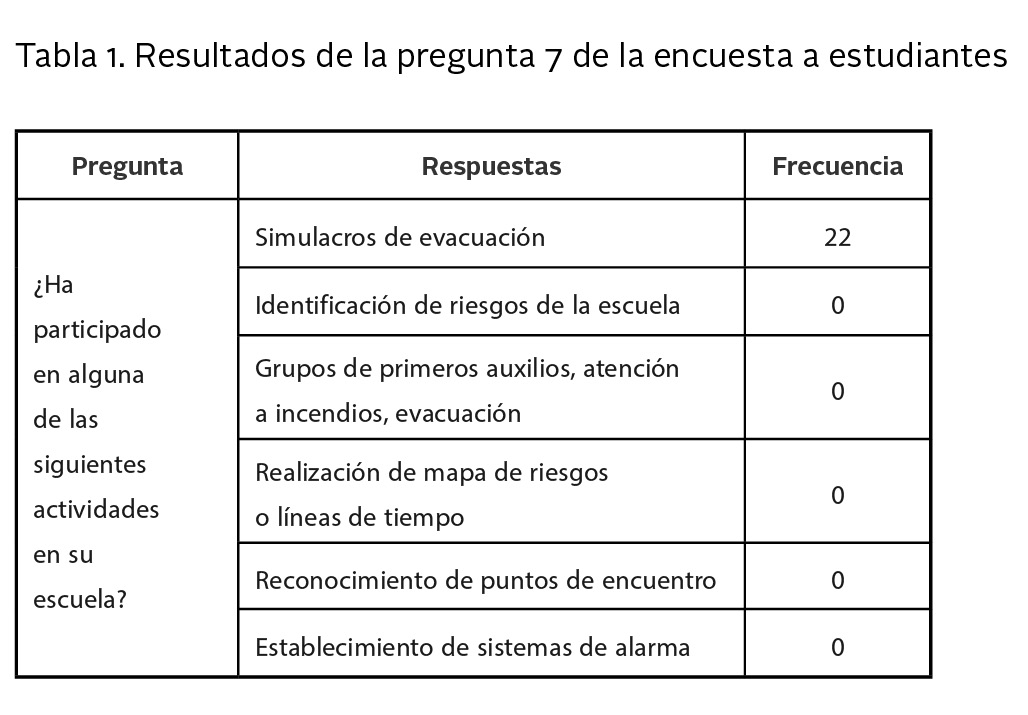 Sobre la participación en actividades asociadas al riesgo, únicamente una tercera parte de los estudiantes reconoció los simulacros de evacuación como una de ellas (tabla 1), lo que refleja la necesidad de la IE de aplicar estrategias de reconocimiento y acción sobre la gestión.