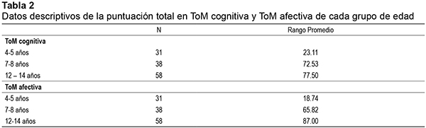 En segundo lugar se realizó un análisis para comparar la puntuación total tanto de ToM cognitiva como de ToM afectiva entre grupos de edad. Para ello se aplicó nuevamente la prueba H de Kruskal-Wallis de comparación de rangos. Se obtuvieron diferencias significativas entre los grupos de edad, en ToM cognitiva (X²= 88,940, p=.000) y en ToM afectiva (X² =94.643, p= .000). En la tabla 2 puede observarse cómo a medida que se avanza en edad, mayor es el rango promedio de puntuaciones tanto en ToM cognitiva como en ToM afectiva, si bien es cierto que en ToM cognitiva hay una menor diferencia entre el grupo de 7-8 años y el grupo de 12-14 años.