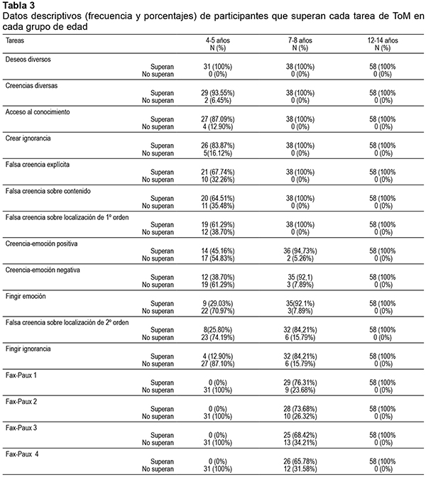 En tercer lugar se realizaron análisis de diferencias según la edad para cada prueba de ToM; para ello se aplicó la prueba chi-cuadrado. En la tabla 3 puede observarse la frecuencia y porcentaje de participantes que superan cada tarea en cada grupo de edad. En el grupo de 4-5 años se puede observar una disminución progresiva de participantes que superan cada prueba, desde la tarea de Deseos Diversos (superada por el 100%) hasta la tarea de Faux Paux (no superada por ninguno). En este primer grupo, la tarea de Creencia-Emoción Positiva es la que marca el punto de inflexión a partir del cual más del 50% de los participantes no superan las pruebas. Es exactamente a partir de la tarea de Creencia-Emoción Positiva cuando en el grupo de 7-8 años empieza a disminuir progresivamente el porcentaje de participantes que superan las tareas. En el grupo de 12-14 años el 100% de los participantes supera todas las tareas.