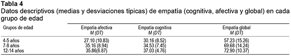Para localizar las diferencias entre grupos se realizaron de nuevo pruebas U de Mann-Whitney corrigiendo el incremento de alfa mediante el procedimiento Bonferroni (αc = 0.016).En los tres casos (empatía afectiva, empatía cognitiva y global) los análisis muestran diferencias significativas en los contrastes del grupo de los niños más pequeños con cada uno de los otros dos, pero no, entre el grupo de 7-8 años con el de 12-14 años. En cuanto a empatía afectiva: 4-5 y 7-8 años: U=337, p=.002, r=0.366; 4-5 y 12-14 años: U=491, p=.000, r=0.372. En cuanto a empatía cognitiva: 4-5 y 7-8 años: U=420, p=.041, r=0.245; 4-5 y 12-14 años: U=486, p=.000, r=0.377). En cuanto a empatía global: 4-5 y 7-8 años: U=327, p=.002, r=0.38; 4-5 y 12-14 años: U=382, p=.000, r=0.471).