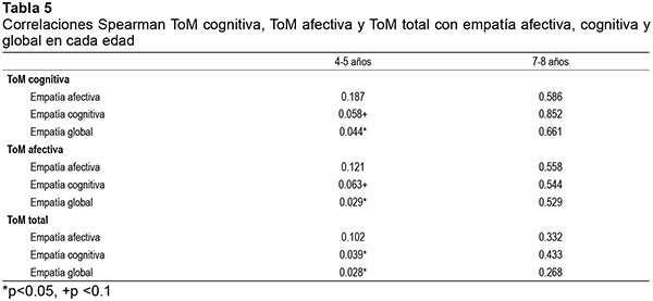 Para analizar la posible relación entre los dos componentes de ToM y los dos componentes de empatía en cada grupo de edad se aplicaron, en primer lugar, análisis de correlación de Spearman en los grupos de edad de 4-5 y de 7-8 años (para el grupo de edad de 12-14 años no se aplicó este análisis ya que todos los participantes de este grupo superaron la batería completa de ToM). Se encuentran correlaciones significativas entre ToM y empatía para el grupo de 4-5 años y sin embargo no en el grupo de 7-8 años. En el grupo de los niños más pequeños se encuentra una correlación con tendencia a la significación entre ToM, tanto cognitiva como afectiva, y empatía cognitiva pero no afectiva.