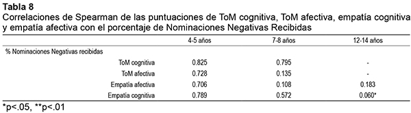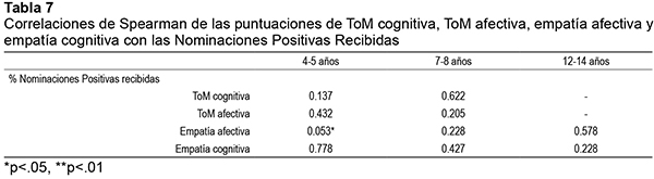 Con el objetivo de comprobar la relación existente entre ToM y empatía con la aceptación que los niños reciben de sus iguales se aplicaron en primer lugar análisis de correlación de Spearman de las puntuaciones de ToM cognitiva, ToM afectiva, empatía afectiva y empatía cognitiva con las puntuaciones de nominaciones positivas y negativas recibidas, para cada uno de los grupos de edad.