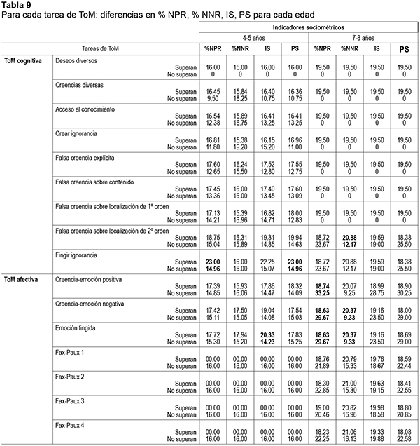 En el grupo de 4-5 años las nominaciones positivas recibidas se relacionan solamente con las puntuaciones de empatía afectiva y no con ningún otro indicador de ToM ni de empatía (tabla 7). En el grupo 7-8 años, aunque las puntuaciones globales de los componentes cognitivo y afectivo de ToM y de empatía no aparecen relacionadas con ninguno de los indicadores de aceptación entre iguales (nominaciones positivas y negativas recibidas), un análisis posterior más pormenorizado de la relación entre cada una de las tareas de ToM cognitiva y de ToM afectiva (tabla 9) sí que pone de manifiesto algunas relaciones.