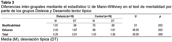 Posteriormente, para comprobar la segunda parte de esta hipótesis, se utilizó la prueba no paramétrica U de Mann-Whitney para analizar las diferencias entre el grupo dislexia y el de desarrollo lector típico en el cuestionario de mentalidad. En la Tabla 3 se presentan los resultados referentes al test de mentalidad. Como se puede observar, existieron diferencias significativas en las dos dimensiones del cuestionario, modificabilidad y relación con el esfuerzo, así como en la suma de ambas, siendo el grupo dislexia el que obtuvo más puntuaciones de MF (en comparación con el grupo control).