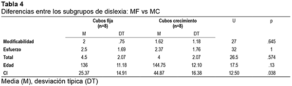 En segundo lugar, para comprobar la hipótesis relativa a las diferencias posibles dentro del grupo de niños con dislexia en base a la medida conductual de Mentalidad I (MF vs MC), se dividió el grupo en dos subgrupos según la elección que habían tomado en la tarea de cubos: aquellos con MF (n=8) y aquellos con MC (n=8). En la Tabla 4 se muestran los estadísticos descriptivos en: el cuestionario de mentalidad (medida de Mentalidad II), edad y CI.