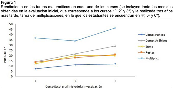 Rendimiento en las tareas matemáticas en cada uno de los cursos (se incluyen tanto las medidas obtenidas en la evaluación inicial, que corresponde a los cursos 1º, 2º y 3º) y la realizada tres años más tarde, tarea de multiplicaciones, en la que los estudiantes se encuentran en 4º, 5º y 6º).
