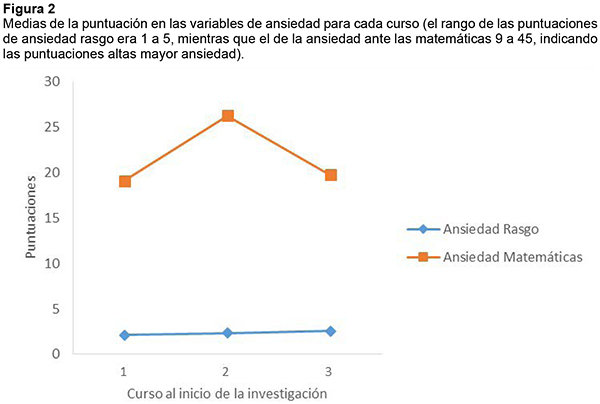 Medias de la puntuación en las variables de ansiedad para cada curso (el rango de las puntuaciones de ansiedad rasgo era 1 a 5, mientras que el de la ansiedad ante las matemáticas 9 a 45, indicando las puntuaciones altas mayor ansiedad).