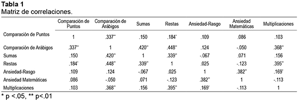 Finalmente, merece la pena señalar algunos de los hallazgos obtenidos en el análisis de correlación y que vienen a confirmar los ya obtenidos en investigaciones previas. En primer lugar, hallamos una fuerte correlación entre la tarea de comparación de arábigos y la de comparación de puntos. Este resultado concuerda con la literatura previa (ver De Smedt et al., 2013 para una revisión), que señala que el rendimiento en tareas que miden el acceso a las representaciones numéricas desde el formato no-simbólico (e. g., comparación de puntos) está fuertemente relacionado con aquellas que miden el acceso a tales representaciones a partir de un código numérico simbólico (e. g., comparaciones de arábigos) y sobre todo con una visión componencial de las tareas, que asume que para desarrollar un correcto conocimiento numérico simbólico, previamente se ha tenido que dominar el conocimiento numérico no verbal que nos permite activar y manipular cantidades de manera intuitiva (e. g., Inglis, Attridge, Batchelor, & Gilmore, 2011; Libertus et al., 2013).
