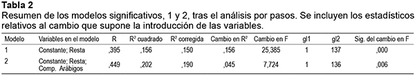 Los resultados del análisis se presentan en las tablas 2, 3 y 4. El modelo inicial que incluía solo la variable fluidez en restas resultó significativo, F(1, 137) = 25.38, p < .001. Este modelo explica el 15% de la variabilidad en el rendimiento en multiplicaciones. Un segundo modelo significativo incluyó el factor restas y la comparación de números arábigos, F(2, 136) = 17.17, p < .001. La inclusión de este segundo factor aumentó la capacidad explicativa del modelo hasta el 19% (ver tabla 2). Ningún otro modelo resultó significativo.