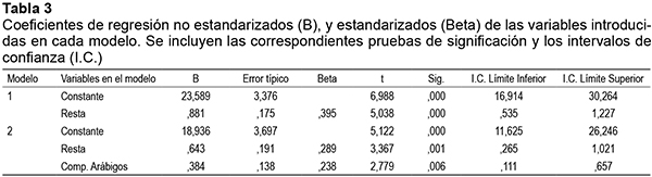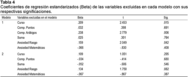 Los coeficientes de regresión para las variables incluidas en cada uno de los modelos se presentan en la tabla 3 y para las excluidas en la tabla 4. De acuerdo con el segundo modelo, la recta de regresión que predice el rendimiento en multiplicaciones de los estudiantes sería: 18.935 + 0.643 (resta) + 0.384 (comparación de arábigos), lo que implica que con el incremento en una unidad del rendimiento en la tarea de restas y en la de comparación de arábigos se incrementaría prácticamente en un punto el rendimiento en la tarea de multiplicaciones.