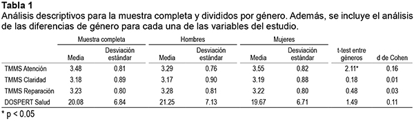 En la Tabla 1 se muestran los análisis descriptivos de las variables incluidas en el estudio para la muestra completa de participantes y divididos por género. Además, se incluye el análisis de las diferencias de género mediante el uso de una prueba t. Las mujeres mostraron puntuaciones significativamente más altas que los hombres en la atención a las emociones.