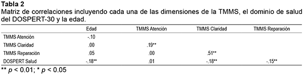 Matriz de correlaciones incluyendo cada una de las dimensiones de la TMMS, el dominio de salud del DOSPERT-30 y la edad.