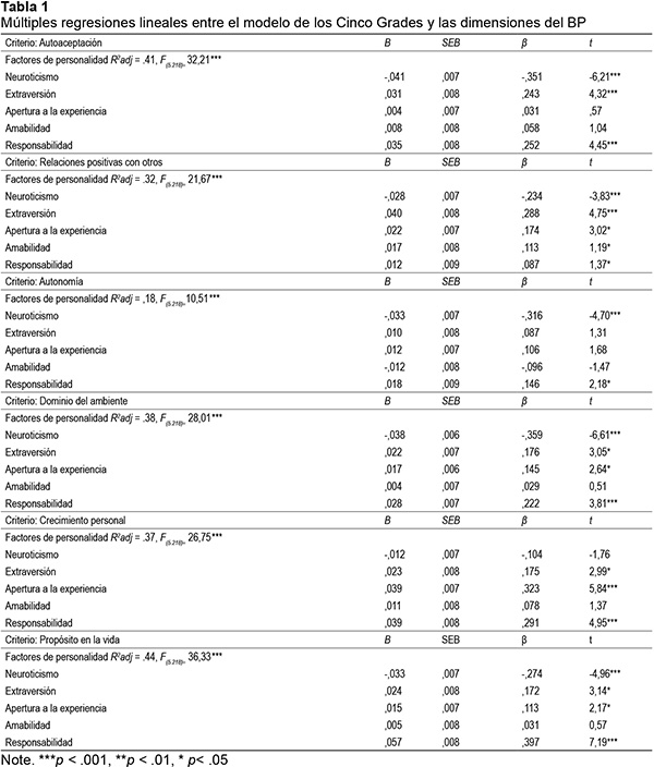 El resultado del análisis de regresión mostró que el modelo de los Cinco Grandes fue un modelo significativo para las seis dimensiones del bienestar psicológico (BP); los modelos explicaron la varianza en un rango de 18% a 44% de BP.