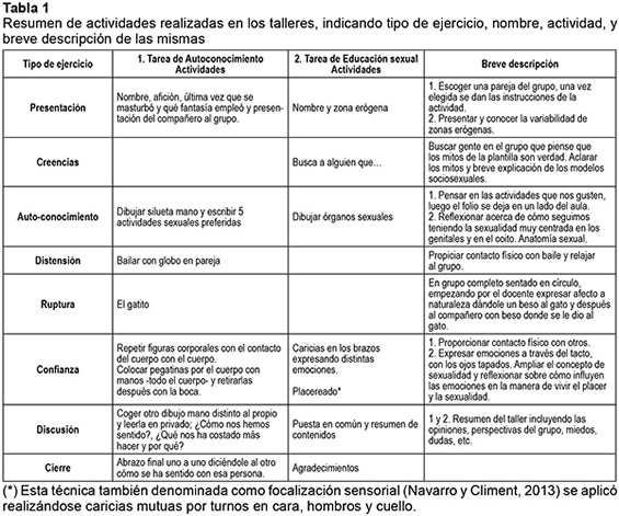 Los talleres de sexualidad tuvieron una duración de 2 horas cada uno, repartidas en dos días contiguos. Se emplearon dinámicas de grupo que incluían interacciones de dos, tres y cuatro participantes, así como del grupo al completo, para que de manera experiencial pudieran trabajarse dichos objetivos. Se trabajó el contacto físico mediante el baile y contacto físico directo del cuerpo con caricias y juegos que fomentaban el contacto; anatomía sexual y zonas erógenas; actividades, gustos y fantasías sexuales; mitos sexuales mediante discusiones; y, finalmente, puestas en común de las percepciones, opiniones, fantasías y miedos que surgieron en los grupos (Tabla 1).