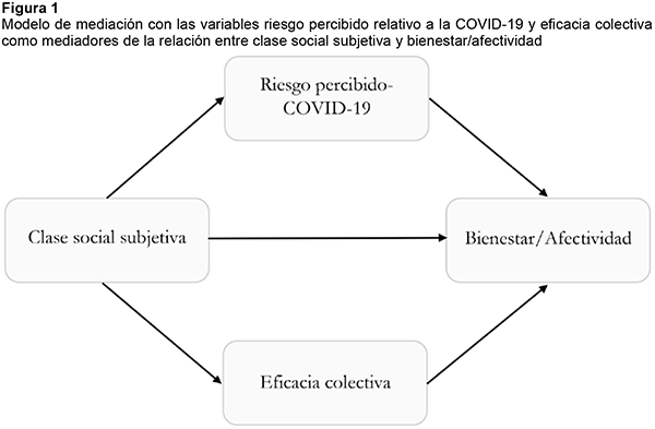 Nosotros proponemos que las personas que perciben pertenecer a una clase social más desfavorecida, en comparación con aquellas de clases más altas, presentarán menores niveles de bienestar y afecto positivo, por un lado, y un mayor afecto negativo, por otro. Asimismo, esperamos que la clase social subjetiva se revele como un predictor significativo de estos indicadores de bienestar y afectividad más allá del género, la edad y el nivel educativo. Por último, consideramos que los menores niveles de bienestar y afecto positivo (y mayores de afecto negativo) presentados por los individuos de clases sociales más bajas (vs. altas) podrían explicarse atendiendo a su mayor percepción de riesgo en relación con la pandemia y a su menor eficacia colectiva percibida a la hora de afrontar los efectos de la misma (Figura 1).