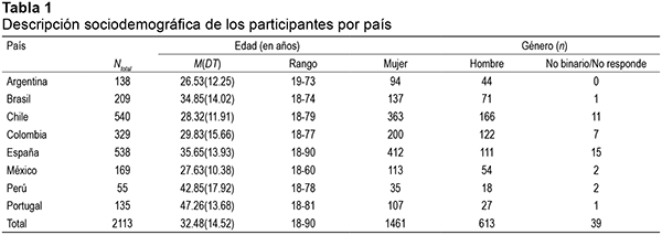 La presente investigación comprendió un total de 2113 participantes (69.1% mujeres) con una edad media de 32.48 años (DT = 14.52). Los participantes, procedentes de un total de 8 países de Iberoamérica (Argentina, Brasil, Chile, Colombia, España, México, Portugal y Perú), cumplimentaron una encuesta en línea durante los meses de abril y julio de 2020. Los participantes proporcionaron consentimiento informado y fueron informados de la confidencialidad de sus respuestas. Este trabajo se enmarca en un proyecto más amplio de corte transcultural, revisado y aprobado por el Comité de Ética de Investigación de la institución académica responsable. En esta investigación el foco se sitúa en países pertenecientes a la región cultural iberoamericana. El motivo radica en el fuerte vínculo histórico y cultural existente entre estos países. A diferencia de otras regiones (p.ej., la Commonwealth y la Francofonía), la iberoamericana es histórica y culturalmente homogénea y comparte, además, otra variedad de elementos vinculantes como señas de identidad y múltiples valores compartidos (Gratius, 2006). La Tabla 1 recoge de forma pormenorizada las características demográficas de cada una de las muestras.