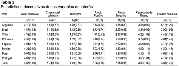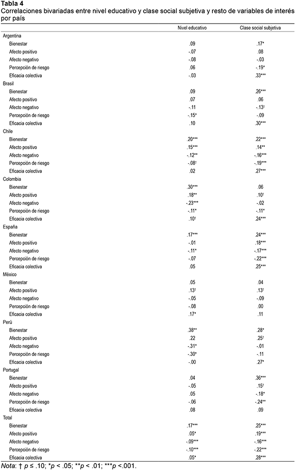 En lo tocante a los correlatos del nivel educativo y la clase social subjetiva con el resto de variables a nivel de país (Tabla 4), nuestros resultados revelaron, en general, que el tamaño de las asociaciones entre la clase social subjetiva y el resto de variables fue superior al de las relaciones del nivel educativo. Asimismo, se observó una correlación positiva entre clase social subjetiva y bienestar en todos los países considerados (a excepción de Colombia y México); la relación más alta se obtuvo en la muestra de Portugal (r = .36, p < .001). Las correlaciones entre la clase social subjetiva y los indicadores de afectividad fueron más bajas. Las relaciones numéricamente más altas se obtuvieron en la muestra española (en el caso del afecto positivo: r = .18, p < .001) y en la portuguesa (en el caso del afecto negativo: r = -.18, p = .038), siendo ambas de bajas a moderadas. Tal y como también se aprecia en la Tabla 4, las muestras correspondientes a Portugal (r = -.24, p = .005) y España (r = -.22, p < .001) mostraron las correlaciones negativas numéricamente más elevadas entre clase social subjetiva y riesgo percibido, las cuales reflejan un tamaño del efecto mediano. Por último, las muestras de Argentina (r = .33, p < .001) y Brasil (r = .30, p < .001) presentaron correlaciones positivas altas entre clase social subjetiva y eficacia colectiva percibida.
