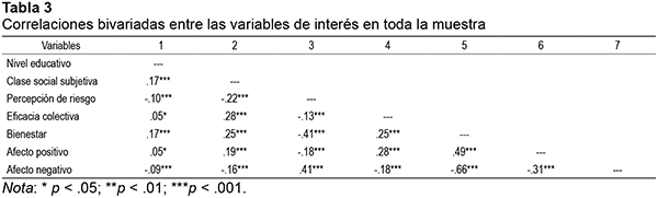 A lo largo de la muestra general, tal y como se puede constatar en la Tabla 3, la clase social subjetiva correlacionó moderada y positivamente con las medidas de bienestar (r = .25, p < .001) y afecto positivo (r = .19, p < .001). Asimismo, una menor clase social subjetiva se relacionó con mayores niveles de afectividad negativa (r = -.16, p < .001). Los datos obtenidos también arrojaron, por un lado, una correlación negativa moderada entre clase social subjetiva y percepción de riesgo vinculada a la crisis de la COVID-19 (r = -.22, p < .001) y, por otro, una correlación positiva de moderada a alta entre clase social subjetiva y eficacia colectiva percibida (r = .28, p < .001). Tal y como también muestra la Tabla 3, la variable nivel educativo mostró el mismo patrón de correlaciones que la clase subjetiva, aunque sus coeficientes de correlación fueron siempre más bajos, reflejando tamaños del efecto de bajos a moderados.