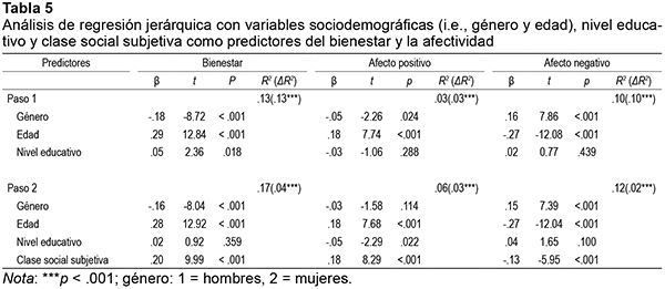Los resultados de los análisis de regresión jerárquica dirigidos a examinar la contribución de la clase social subjetiva al bienestar, afecto positivo y negativo más allá del género, la edad y el nivel educativo aparecen en la Tabla 5.