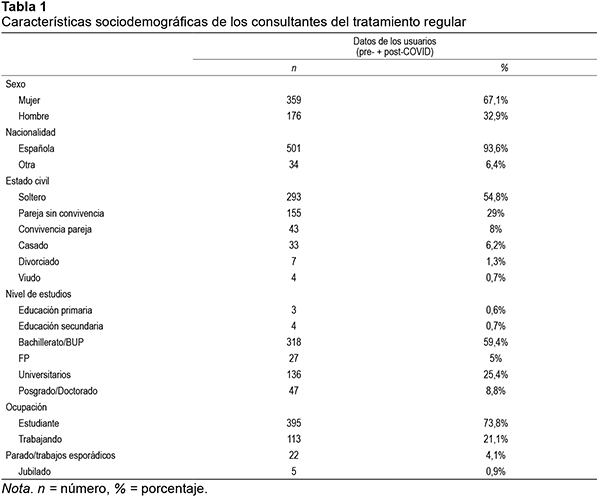 Se analizan los datos de las personas que recibieron asistencia psicológica en la Clínica Universitaria del CPA-UAM entre febrero de 2016 y septiembre de 2021, en una de estas dos modalidades: (1) tratamiento psicológico regular y (2) atención telefónica gratuita, una modalidad que tuvo lugar únicamente entre abril y julio de 2020, con motivo del confinamiento por la crisis sanitaria por la COVID-19. En el caso del tratamiento psicológico regular, se presentan los datos de 535 usuarios de la consultoría general del centro, 448 en la etapa pre-COVID (desde febrero de 2016 hasta febrero de 2020) y 87 en la etapa post-COVID (los iniciados desde junio de 2020 hasta la actualidad, puesto que durante el confinamiento no se atendieron casos nuevos en tratamiento regular y solamente se siguieron atendiendo los que ya estaban en tratamiento).