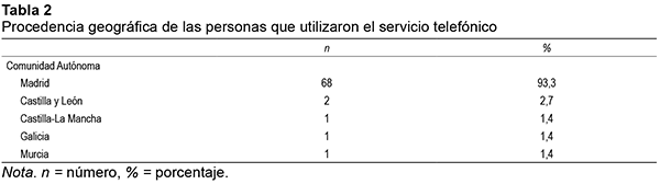 En cuanto a la atención telefónica gratuita, se atendió a 73 personas, todos ellos adultos de entre 18 y 80 años (M = 44,91; DT = 16,75), la mayoría de los cuales eran mujeres (n= 61; 84,7%), frente a un porcentaje menor de hombres (n=12; 15,3%). La Comunidad Autónoma desde la que llamaban predominantemente Madrid (93,3%) y en la Tabla 2 se desglosan otras procedencias geográficas.