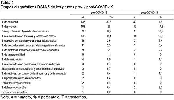 Los diagnósticos DSM-5 de los grupos pre- y post-COVID están recogidos en la Tabla 4. Como se puede observar, los problemas clínicos más frecuentes pre-COVID fueron los trastornos de ansiedad (30,8%), los trastornos depresivos (23%) y otros problemas que pueden ser objeto de atención clínica (17,9%). Por su parte, en el grupo post-COVID, los más frecuentes fueron los trastornos de ansiedad (46%), seguidos por los trastornos depresivos (17,2%) y los trastornos relacionados con traumas y factores de estrés (12,6%). No se observaron diferencias estadísticamente significativas entre los dos grupos (χ2 = 18,56, p = 0,234).